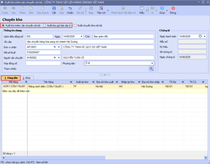 • Tại tab Hàng tiền: nhập thông tin vật tư hàng hóa: Mã hàng, Tên hàng, Xuất tại kho, Địa chỉ kho xuất, Địa chỉ kho nhập, TK nợ, TK có, …