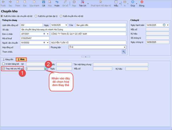 Bước 3: Khai báo các Thông tin chung trên chứng từ chuyển kho: Lệnh điều động số, Ngày, Của, Về việc, Đơn vị nhận, Mã số thuế, Người vận chuyển, …