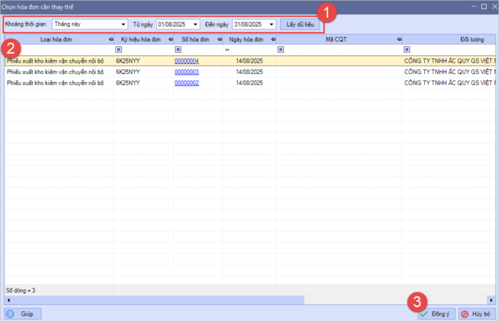 • Trên giao diện chọn hóa đơn thay thế, thiết lập tham số khoảng thời gian chọn hóa đơn sau đó nhấn Lấy dữ liệu: