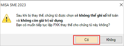 • Chương trình hiển thị cảnh báo: Sau khi bị thay thế, chứng từ được chọn sẽ không thể ghi sổ kế toán và không còn giá trị sử dụng.