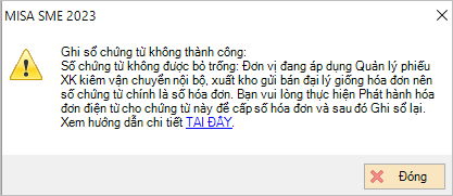 Lưu ý: Chương trình tiếp tục hiện thị cảnh báo ghi sổ chứng từ không thành công do đơn vị đang áp dụng Quản lý phiếu xuất kho kiêm vận chuyển nội bộ, xuất kho gửi bán đại lý giống hóa đơn nên số chứng từ chính là số hóa đơn.
