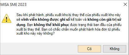 Bước 6: Nhấn Phát hành HĐ, chương trình hiển thị cảnh báo: Sau khi phát hành, phiếu xuất kho bị thay thế của phiếu xuất kho này sẽ vĩnh viễn không được ghi sổ kế toán và không còn giá trị sử dụng. Người dùng sẽ không thể khôi phục được trạng thái ban đầu của phiếu xuất kho bị thay thế.