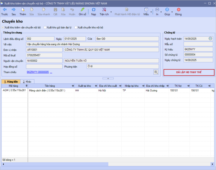 Bước 8: Sau khi phát hành thành công, người dùng cần thực hiện Ghi sổ phiếu xuất kho được thay thế. Khi đó, phiếu xuất kho bị thay thế sẽ tự động được chuyển sang trạng thái Đã lập HĐ thay thế:
