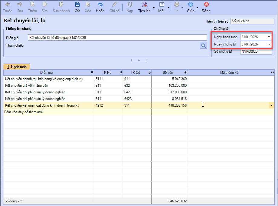 Bước 2: Chọn Ngày hạch toán, Ngày chứng từ là ngày cuối kỳ cần kết chuyển. Ví dụ: Cần kết chuyển lãi lỗ tháng 1/2026 thì ngày hạch toán, ngày chứng từ chọn là 31/01/2026.