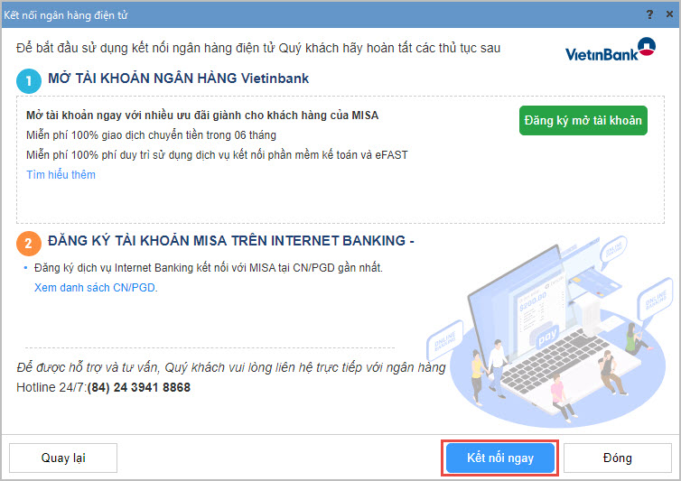 Lưu ý: Trường hợp trong Danh mục\Tài khoản ngân hàng chỉ có 1 tài khoản ngân hàng là tài khoản có liên kết với MISA thì sẽ không có bước chọn Ngân hàng kết nối mà chương trình sẽ ngầm định tài khoản kết nối là tài khoản trong danh mục.