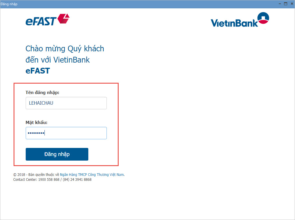 Bước 5. Nhập tài khoản Kết nối ngân hàng điện tử (là tài khoản Internet Banking lập lệnh (Maker) ). Nhấn Đăng nhập.