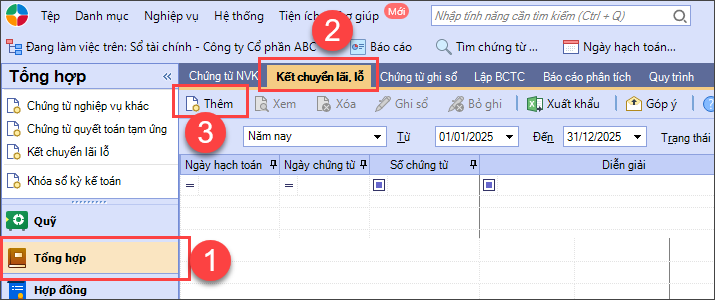 Bước 1: Vào phân hệ Tổng hợp\ tab Kết chuyển lãi, lỗ \chọn chức năng Thêm