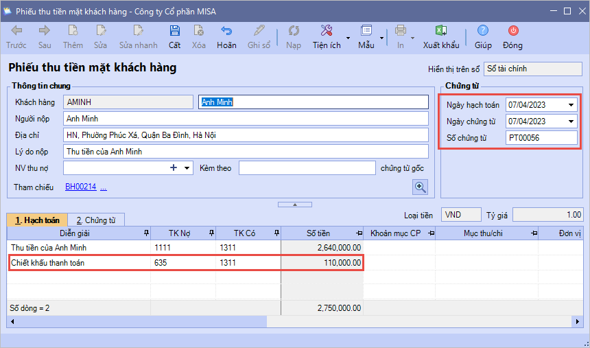 Bước 5: Khi hạch toán thu tiền khách hàng thanh toán công nợ trước thời hạn thanh toán đã thiết lập điều khoản, chương trình tự động hạch toán dòng chiết khấu thanh toán Nợ 635/Có 111, 112,131,…. theo tỷ lệ chiết khấu tương ứng.