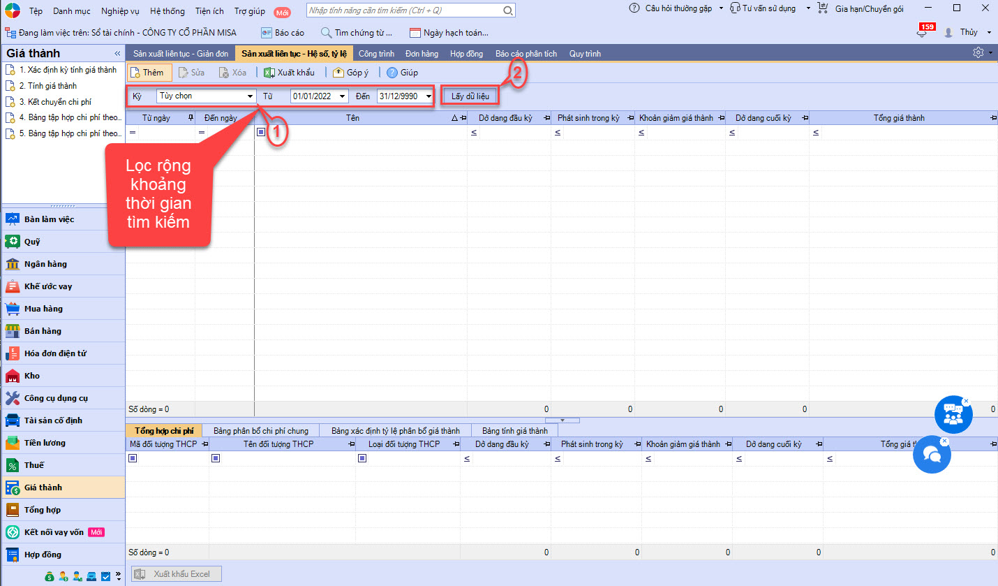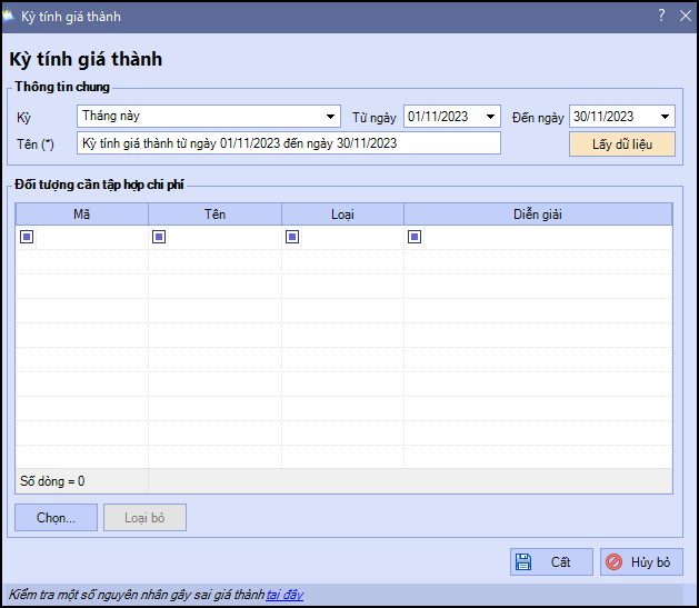 - Biểu hiện lỗi khi lấy dữ liệu kỳ tính giá thành