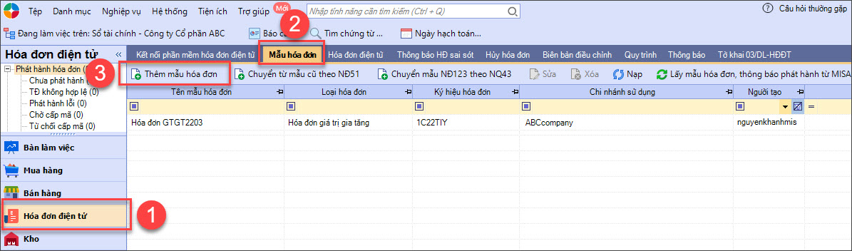 Bước 1: Vào phân hệ Hoá đơn điện tử/ tab Mẫu hóa đơn, nhấn Thêm mẫu hoá đơn.