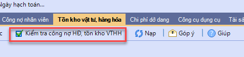 Bước 2: Chọn Tab Công nợ khách hàng, Tab Công nợ Nhà cung cấp hoặc Tab Tồn kho vật tư hàng hóa.