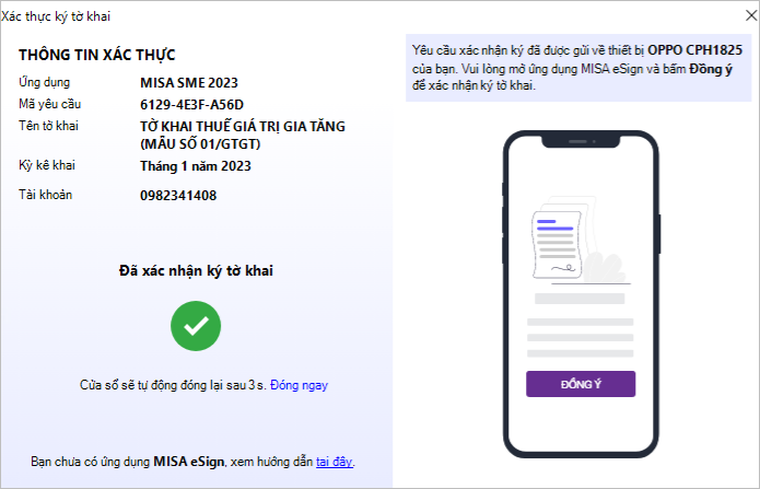 Từ MISA SME 2023 – R11, tích hợp ký phiên MISA esign – Chỉ xác nhận ký từ xa 1 lần đầu và tự động ký (không cần xác nhận lại) trong vòng 12 tiếng sau đó.