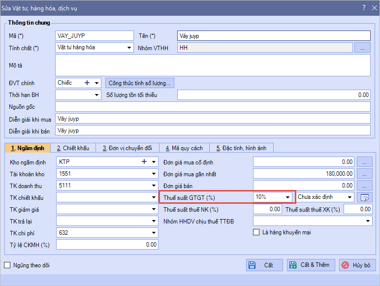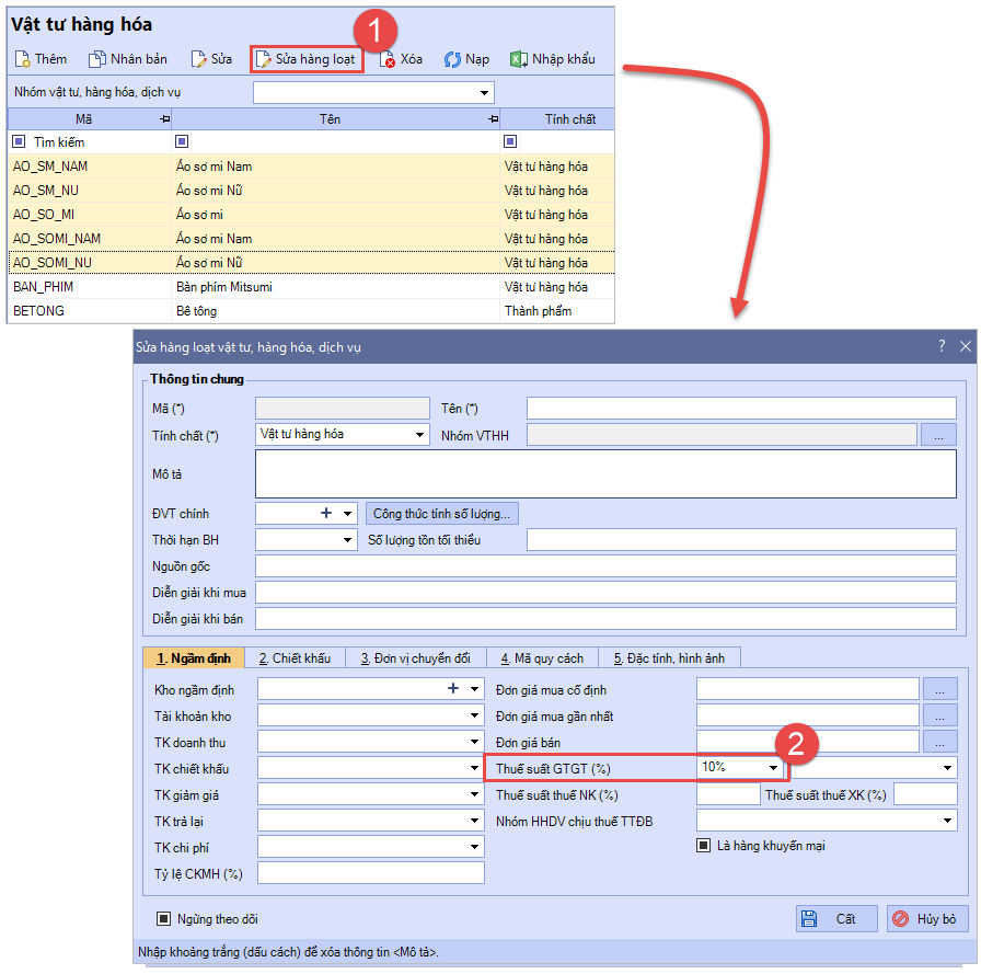 Cách 1: Sửa hàng loạt thuế suất của vật tư hàng hóa (có cùng tính chất)