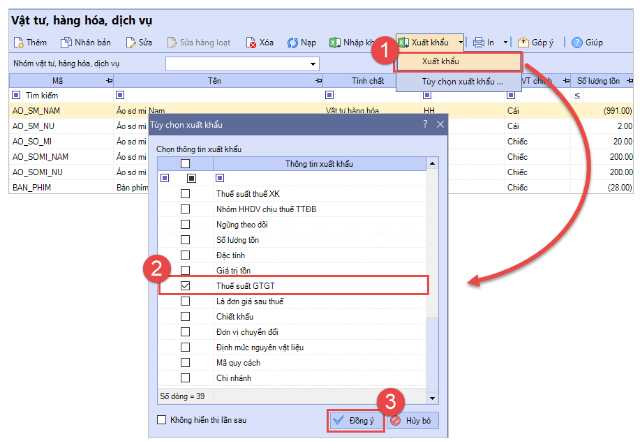 Cách 3: Nhập khẩu cập nhật bằng file excel Bước 1: Trên giao diện danh sách Vật tư hàng hóa, nhấn Xuất khẩu, tích chọn thông tin xuất khẩu là Thuế suất GTGT. Nhấn Đồng ý.
