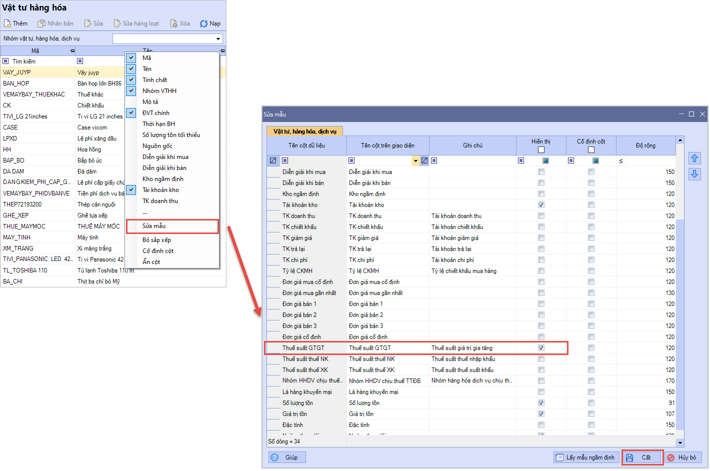 - Vào danh mục Vật tư hàng hóa / Chuột phải vào thanh tiêu đề / Chọn chức năng Sửa mẫu tích vào ô Hiển thị để thiết lập hiển thị cột Thuế suất GTGT trên danh sách vật tư hàng hóa (nếu cột này đang ngầm định ẩn) tìm và lọc các mặt hàng có thuế suất 8% cần chỉnh sửa trên danh sách vật tư hàng hóa.
