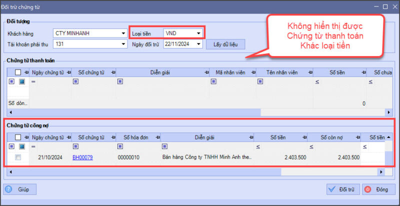 Ví dụ: Khi bán hàng cho Khách hàng A, ghi nhận công nợ là Loại tiền VND nhưng khi khách hàng thanh toán là Loại tiền USD, dẫn đến lúc Đối trừ chứng từ chọn loại tiền VND thì không hiển thị số liệu của Chứng từ thanh toán USD.