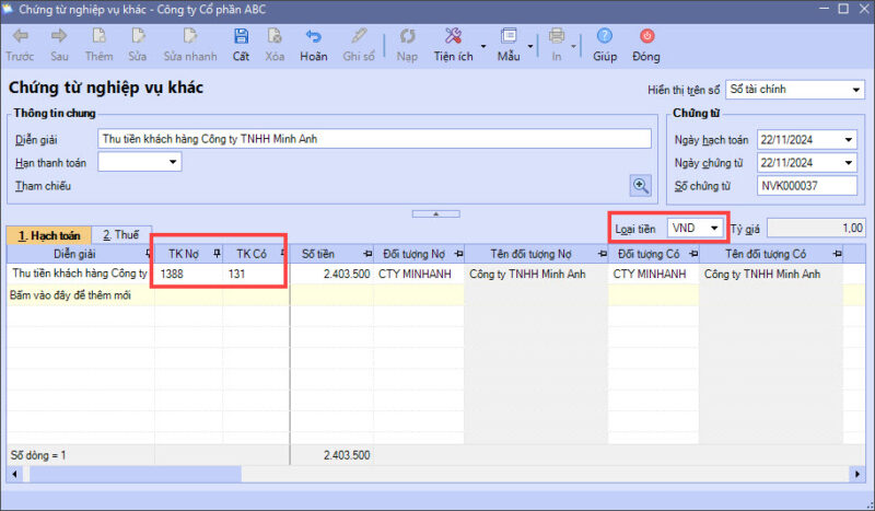 - Hạch toán: Nợ 1388/ Có 131 (chọn Loại tiền ghi nhận công nợ ban đầu, ví dụ: VND)