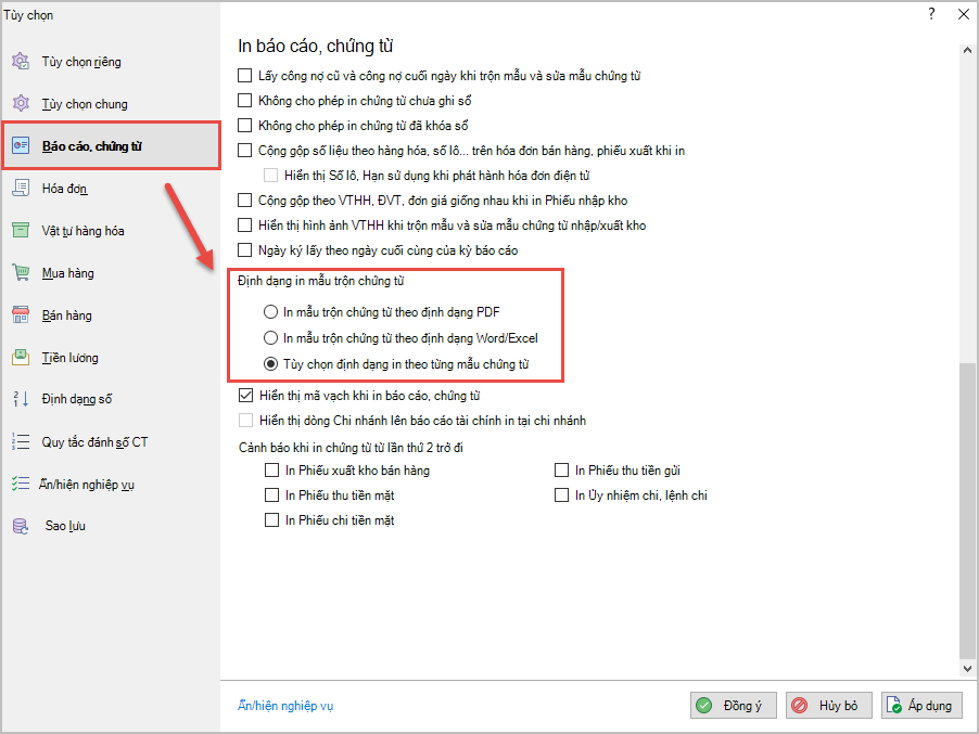• Tùy chọn định dạng in theo từng mẫu chứng từ