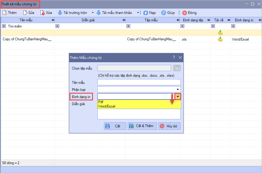 • Nếu chọn “Tùy chọn định dạng in theo từng mẫu chứng từ“: Người dùng có thể tùy chọn in theo PDF hoặc Word/excel với từng loại mẫu trộn khi thêm mẫu thiết kế chứng từ mới