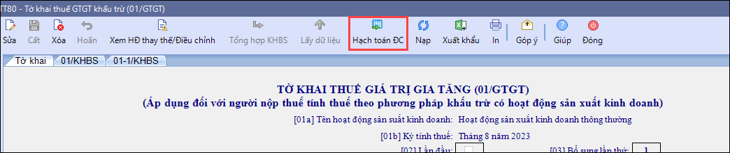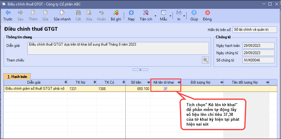 Bước 5: Kiểm tra trường hợp lập tờ khai bổ sung làm tăng/giảm số thuế giá trị gia tăng còn được khấu trừ chuyển kỳ sau thì nhấn Hạch toán ĐC. Chương trình sẽ sinh ra chứng từ Điều chỉnh thuế GTGT