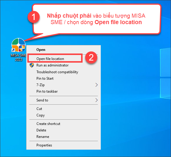 Bước 2: Tại màn hình Desktop, nhấn chuột phải vào biểu tượng MISA SME 2023\chọn Open file location