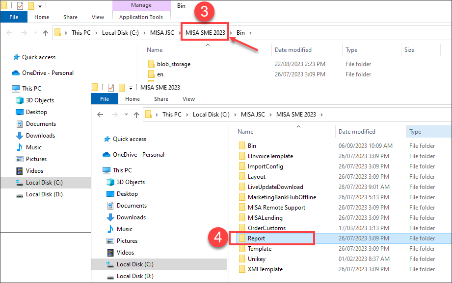 Bước 3: Phía trên đường dẫn thư mục, nhấn về mục MISA SME 2023\ Chọn thư mục Report