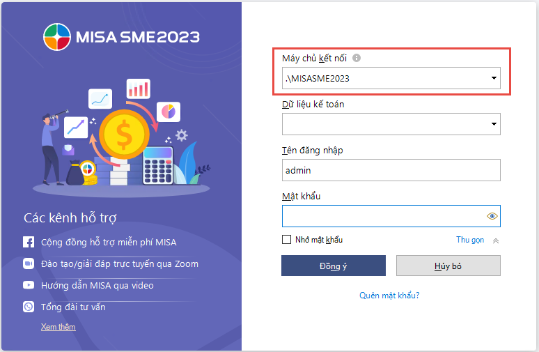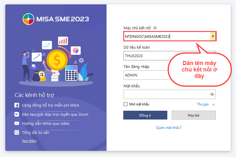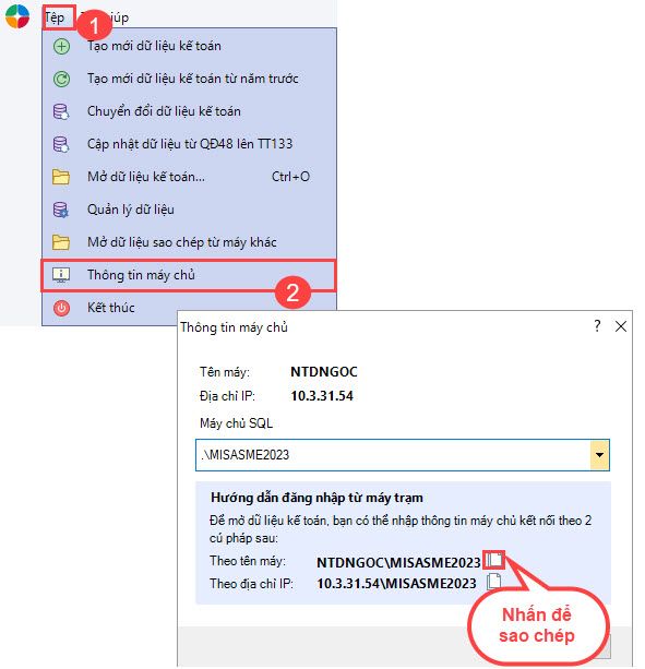 Ví dụ trong trường hợp trên, nếu kiểm tra máy chủ kết nối là NTDNGOC\MISASME2023 thì sang máy trạm cũng để là NTDNGOC\MISASME2023