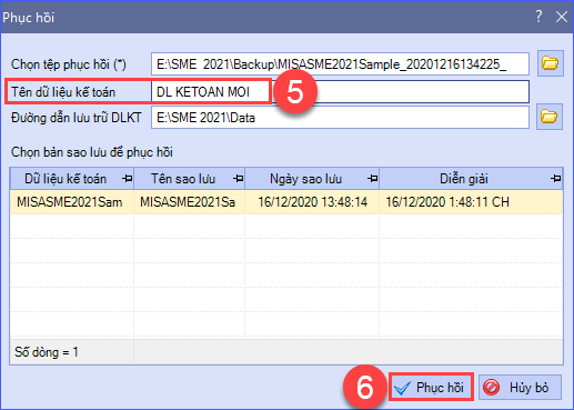 Bước 6: Đổi tên dữ liệu kế toán. Gõ tên mới vào ô Tên dữ liệu kế toán, nhấn Phục hồi.