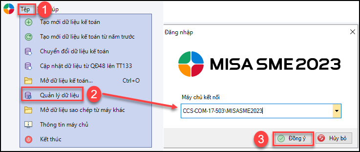Bước 1: Vào Tệp/Quản lý dữ liệu → Chọn máy chủ chứa dữ liệu kế toán, sau đó nhấn Đồng ý để sao lưu dữ liệu kế toán cần nhân bản.