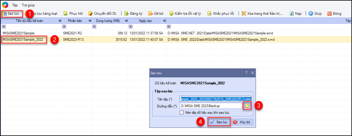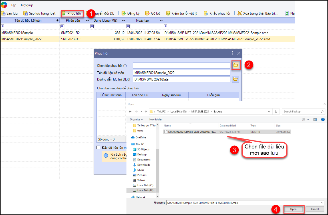 Bước 5: Chọn tệp phục hồi: Nhấn vào biểu tượng folder/ Tìm đến đường dẫn chứa file sao lưu (ví dụ: D:\MISA SME 2023\Backup như hình trên). Chọn file sao lưu vừa thực hiện sao lưu ở bước 1, nhấn Open.