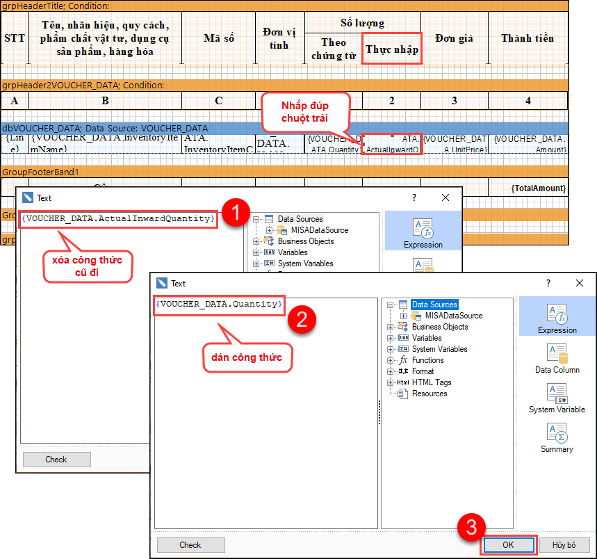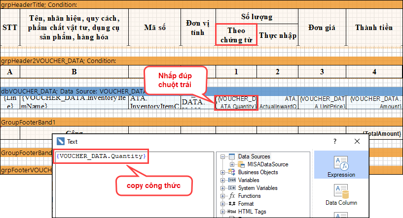 - Xóa dòng công thức hiện tại đi, dán công thức vừa copy ở bước 2 vào ô này. Ví dụ: dán công thức “{VOUCHER_DATA.Quantity}” vào.