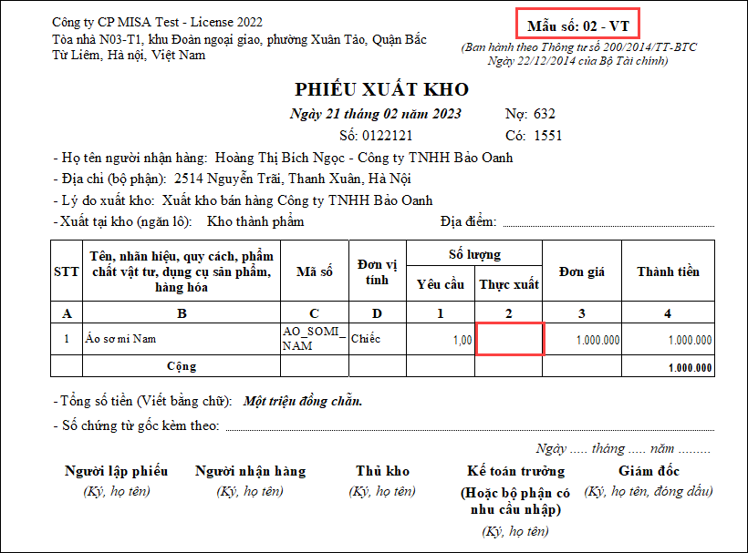 Khi in phiếu xuất kho (mẫu số 02 – VT), số lượng cột Thực xuất đang hiện trống.
