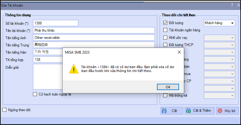 Nguyên nhân: Do trước đó tài khoản đã có số dư ban đầu, khi tích chi tiết theo đối tượng, phần mềm yêu cầu phải xóa số dư trước đó để cập nhật lại số dư chi tiết theo đối tượng theo dõi, đảm bảo tính logic của dữ liệu.