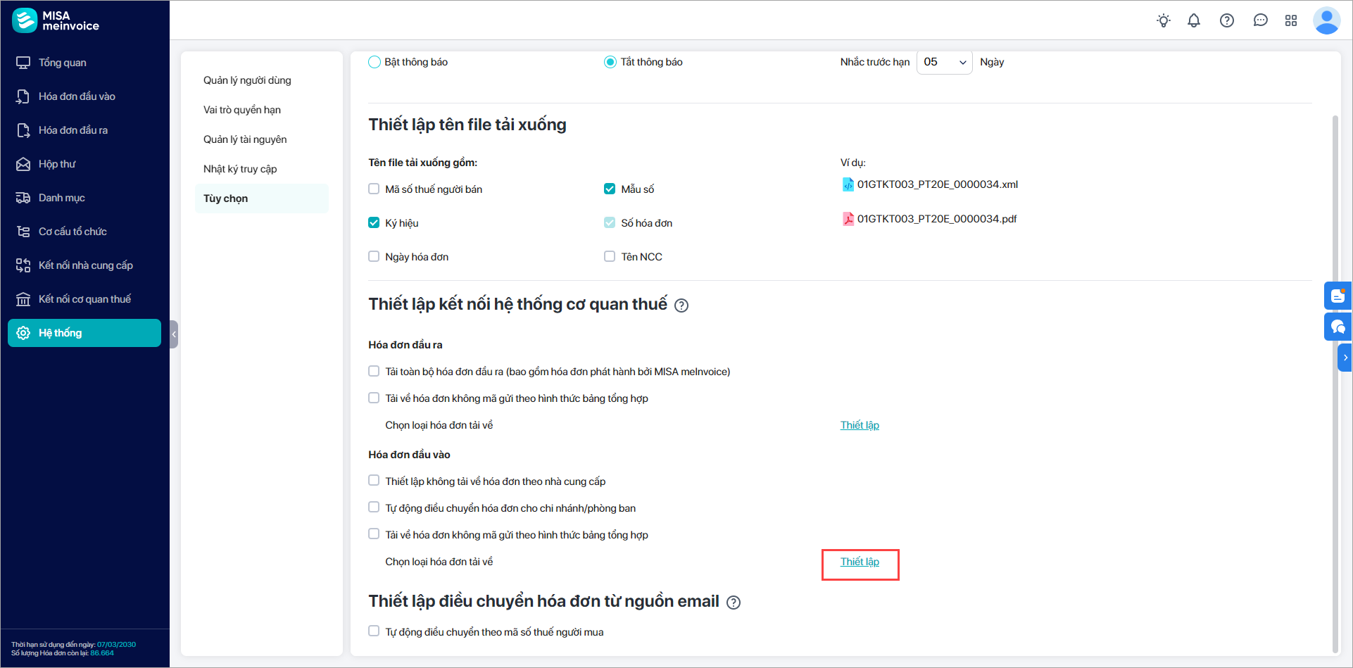 Bước 3: Tại mục Chọn loại hóa đơn tải về, nhấn Thiết lập