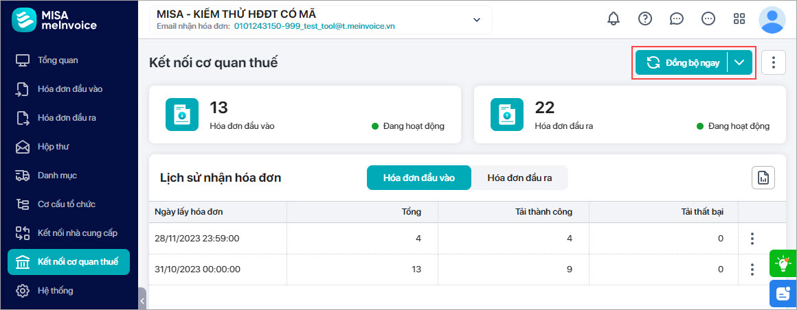 Bước 4: Vào mục Kết nối cơ quan thuế, nhấn Đồng bộ ngay chọn lại khoảng thời gian cần lấy hóa đơn để cập nhật danh sách hóa đơn/ Đợi quá trình đồng bộ lại xong vào mục Hóa đơn đầu vào để kiểm tra lại hóa đơn đã về chưa