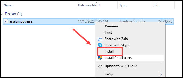 2.1. Cài FontBước 1: Tải font chữ Arial Unicode MS về máy tính tại đây. Bước 2: Tích chọn vào file vừa tải về máy, nhấn chuột phải chọn Install để cài font chữ.