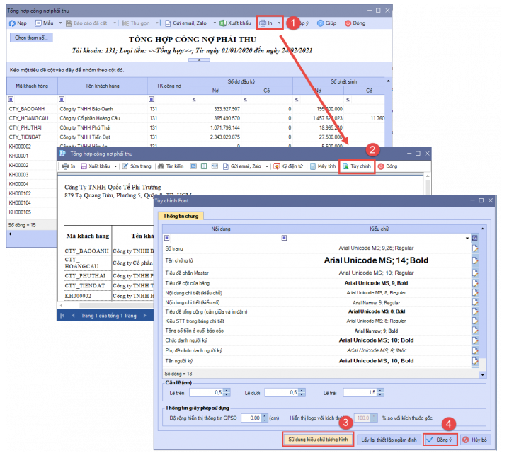Nội dung bài viết gồm: Hướng dẫn cài đặt font Arial Unicode MS, chỉnh sửa mẫu chứng từ và thiết lập kiểu chữ tượng hình cho báo cáo để hiển thị chính xác tiếng Trung.