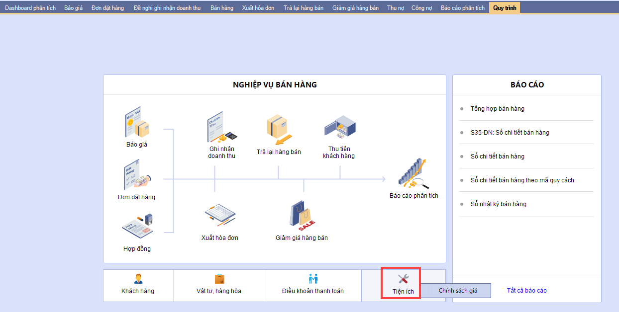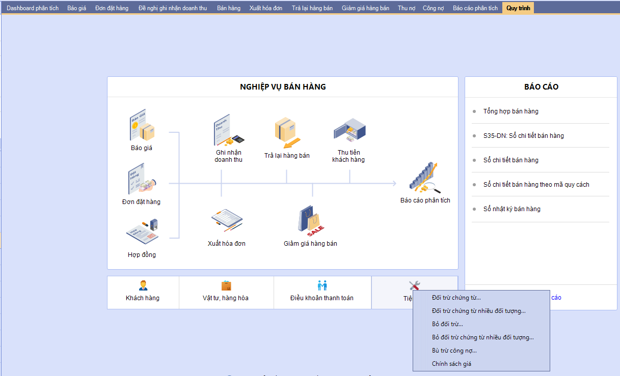 - Khi đó vào phân hệ Bán hàng\Quy trình\Tiện ích sẽ hiển thị chức năng đối trừ chứng từ.