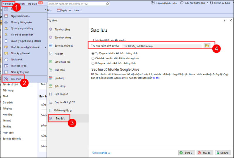 Bước 1: Vào Hệ thống > Tùy chọn > Sao lưu.
