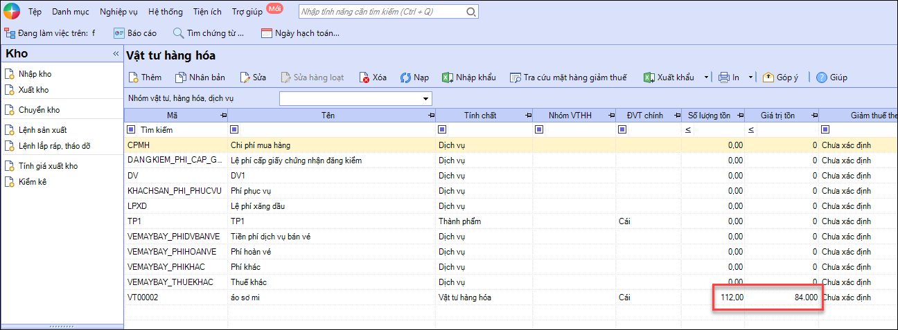 - Chỉ tiêu số lượng tồn và giá trị tồn trên danh mục Vật tư hàng hóa lấy số liệu đến chứng từ phát sinh cuối cùng.
