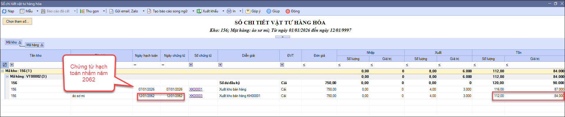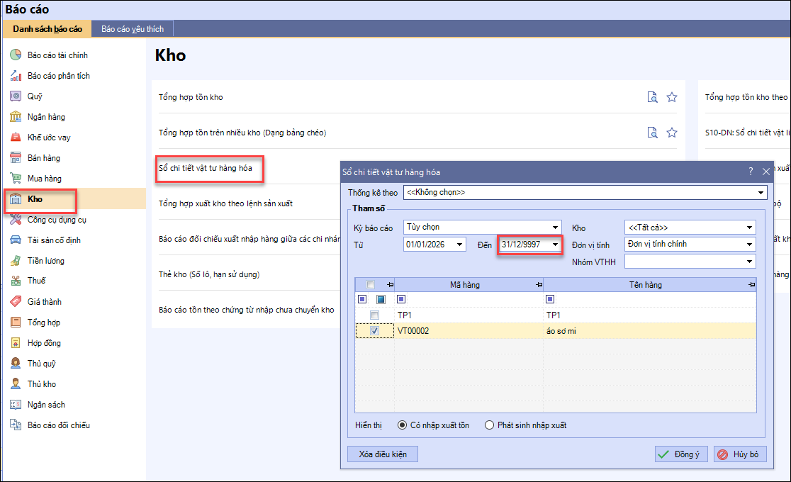 Bước 1: Vào Báo cáo \ Kho \ Sổ chi tiết vật tư hàng hóa, chọn tham số kỳ báo cáo đến ngày 31/12/9997, nhấn Đồng ý