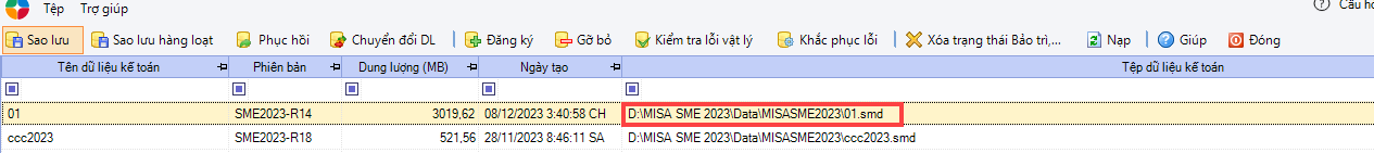 Bước 2: Tại dòng tên dữ liệu, xem đường dẫn tại cột Tệp dữ liệu kế toán để biết dữ liệu gốc lưu ở ổ đĩa nào.