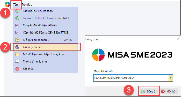 Giải pháp: Kiểm tra thư mục chứa dữ liệu gốc bằng cách sau (nếu dùng mô hình máy trạm/chủ thì kiểm tra ở Máy chủ): Bước 1: Vào Tệp/Quản lý dữ liệu/Nhấn Đồng ý