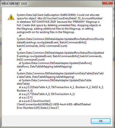 Mục đích: Hướng dẫn xử lý lỗi không ghi sổ hoặc không cất được chứng từ do phần mềm báo lỗi System.Data.SqlException (0x80131904)…because the ‘PRIMARY’ filegroup is full… trên phần mềm kế toán.
