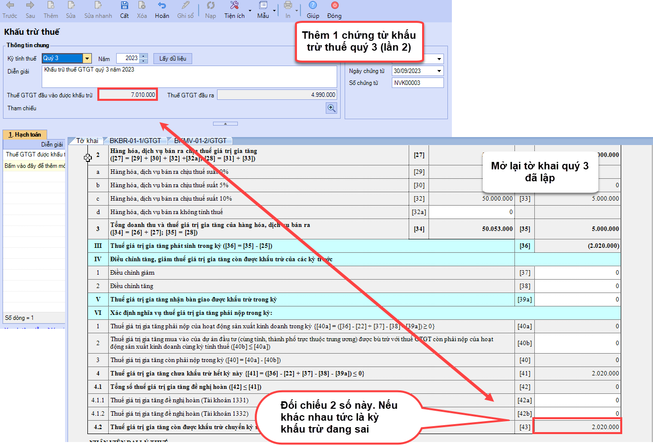 Sau khi kiểm tra xử lý các nguyên nhân trên xong cần Xóa bút toán khấu trừ đi và khấu trừ lần lượt lại (Ví dụ khấu trừ quý 1 trước rồi khấu trừ tiếp cho các quý sau đó)