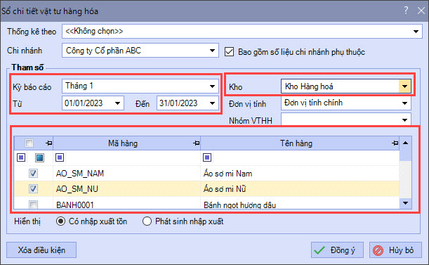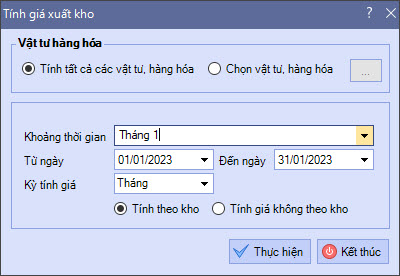 2. Chọn mặt hàng cần kiểm tra / chọn Kho đang xuất trên chứng từ / khoảng Thời gian tính giá.