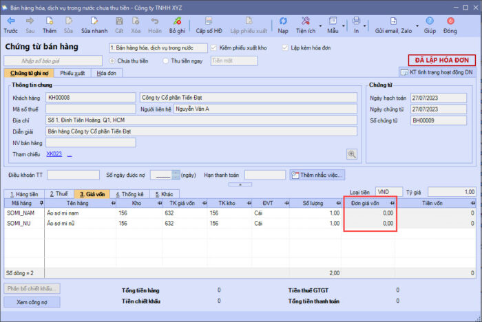 =>Vào Nghiệp vụ/ Nhập số dư ban đầu/ Tab Tồn kho VTHH chọn mã hàng đó kiểm tra xem phần số dư đã điền đơn giá của VTHH chưa, nếu có số lượng, giá trị nhưng đơn giá đang để bằng 0 thì phần mềm không lấy được đơn giá xuất kho. => Sửa lại số dư đầy đủ số lượng, đơn giá, thành tiền sau đó Tính lại giá xuất kho. ![]()