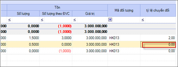 ![]() Kiểm tra tại mục Tồn, cột Số lượng và Số lượng theo đơn vị tính chính xem có khớp nhau không, ở đây MISA có chụp hình ví dụ minh họa cột Số lượng hết nhưng cột Số lượng đơn vị tính chính bị âm số lượng 1 => vì vậy phần đơn vị chuyển đổi trên chứng từ bị sai phần tỷ lệ dẫn đến bị lỗi.