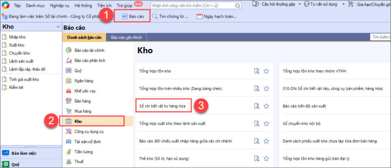Nếu tính xong kiểm tra vẫn không lên giá vốn thì chuyển qua Bước 2. Bước 2: Kiểm tra mặt hàng đang không lên giá vốn có xuất quá số lượng tồn kho không? 1. Vào Báo cáo/ Kho / Sổ chi tiết vật tư hàng hóa.