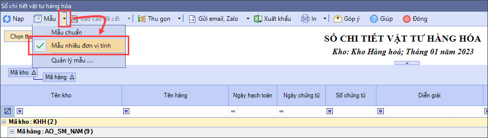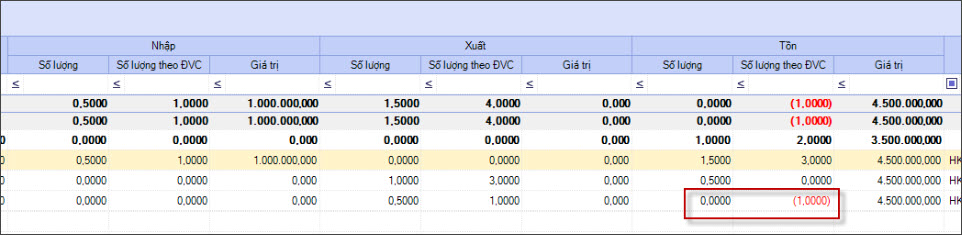 Ví dụ: mặt hàng này có đơn vị chính là Chai , đơn vị chuyển đổi là Bộ, tỷ lệ chuyển đổi là 1 Bộ = 2 chai => cột số lượng = Số lượng theo đơn vị tính chính *2 lần tuy nhiên như hình minh họa tại dòng số 2 tồn kho số lượng là 0,5 nhưng số lượng theo Đơn vị tính chính là 0 dẫn đến khi xuất kho tiếp phần đơn vị tính chính bị âm => vì vậy Tính giá xuất kho sẽ không lên đúng. => Giải pháp: ở chứng từ tại dòng bị sai lên, sau đó vào Mẫu/ Chọn Mẫu nhiều đơn vị tính kiểm tra lại cột tỷ lệ chuyển đổi đúng chưa, nếu chưa đúng thì nhấn Bỏ ghi/Sửa chứng từ, chọn sang 1 mã hàng khác và chọn lại mã hàng đó, gõ lại số lượng, đơn giá và xem lại báo cáo, đồng thời kiểm tra tiếp các dòng khác xem có chênh lệch phần này nữa hay không thì sửa lại cho đúng và Tính lại giá xuất kho.